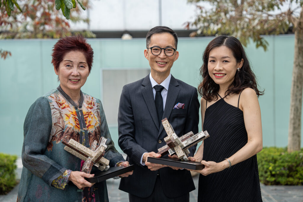 左起:新加坡华族文化贡献奖(个人)2024得主严众莲女士、新加坡华族文化贡献奖(团体)2024得主九年剧场艺术总监及联合创办人谢燊杰和剧团总监及联合创办人徐山淇